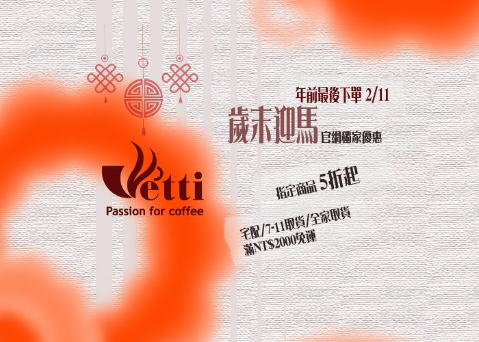 年節出貨公告 因應年節假期, 將於2026/02/12至2026/02/22暫停出貨服務 期間仍可正常下單, 所有訂單將於2/23起依序出貨 造成不便,敬請見諒 感謝您的體諒與支持 维堤咖啡祝您新年快樂!